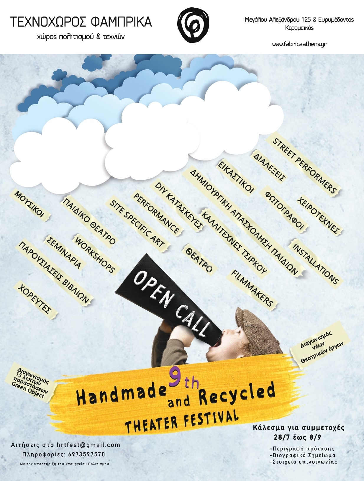 Η Πολυδραστική Ομάδα Τέχνης Fabrica Athens διοργανώνει φέτος το 9th Handmade & Recycled Theater Festival. Το αγαπημένο μας φεστιβάλ στη γειτονιά του Κεραμεικού επιστρέφει για ένατη συνεχόμενη χρονιά!