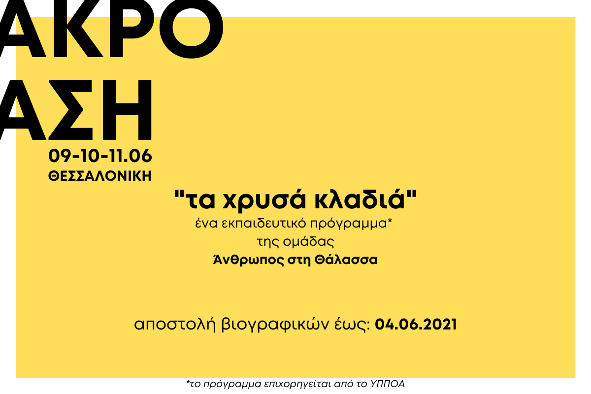 Η θεατρική ομάδα «Άνθρωπος στη θάλασσα» πραγματοποιεί ακρόαση για δύο ηθοποιούς, έναν άντρα και μία γυναίκα, ερμηνευτικής ηλικίας έως 30 ετών, για τις ανάγκες του επιχορηγούμενου από το ΥΠΠΟΑ εκπαιδευτικού προγράμματος «Τα χρυσά κλαδιά» σε σκηνοθεσία Κλαίρης Χριστοπούλου. Το πρόγραμμα απευθύνεται σε παιδιά και εφήβους ηλικίας 10-18 ετών και πρόκειται να παρουσιαστεί σε σχολεία και άλλους πολιτιστικούς χώρους στην Ελλάδα τη σεζόν 2021 – 2022.