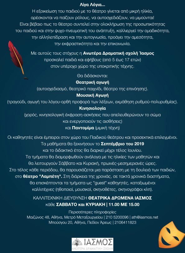 Με αυτούς τους στόχους η Ανώτερα Δραματική σχολή Ίασμος προσκαλεί παιδιά και εφήβους (από 5 έως 17 ετών) στον υπέροχο χώρο της υποκριτικής τέχνης.