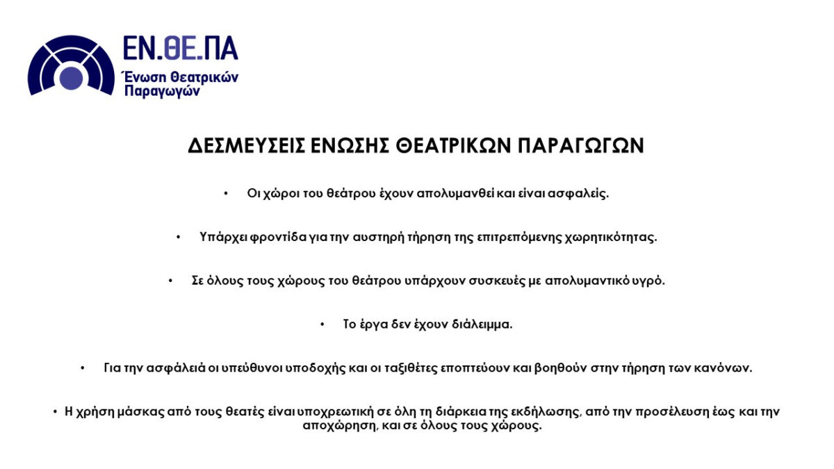 Στις 12 Οκτωβρίου 2020, ανακοινώθηκε ότι επιτρέπεται να ανοίξουν οι κλειστοί θεατρικοί χώροι, με πληρότητα 30%. Στη θεατρική αγορά είναι γνωστό ότι καμία θεατρική παραγωγή δεν μπορεί να είναι βιώσιμη με ποσοστά πληρότητας 30% ή ακόμη και 50%.