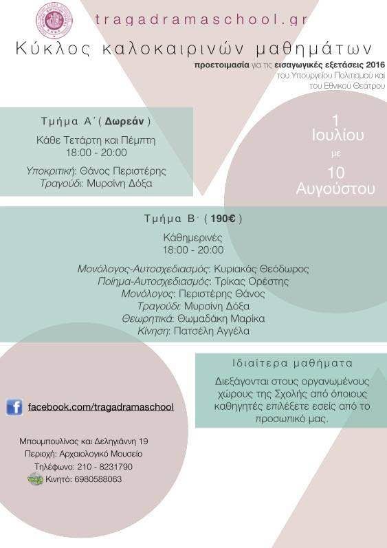 Απο 1η Ιουλίου ξεκινάει ο Κύκλος των καλοκαιρινών μαθημάτων προετοιμασίας για τις εισαγωγικές εξετάσεις του Υπουργείου Πολιτισμού και του Εθνικού Θεάτρου.