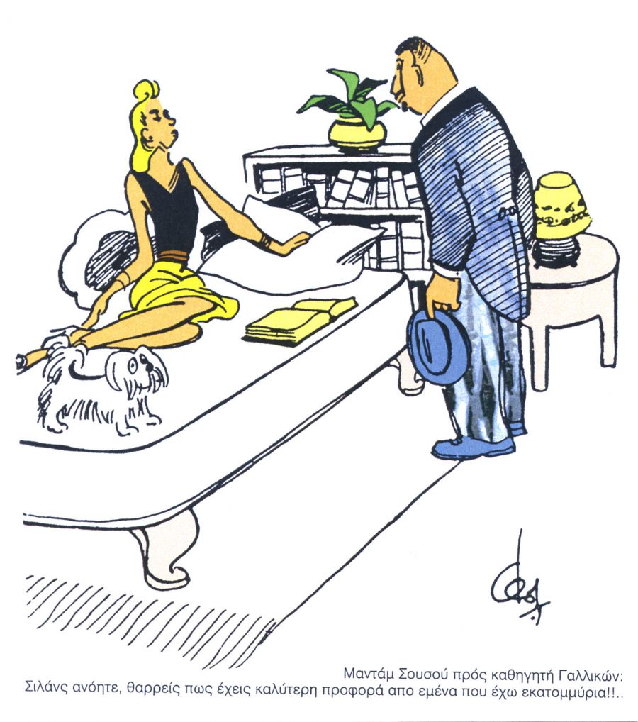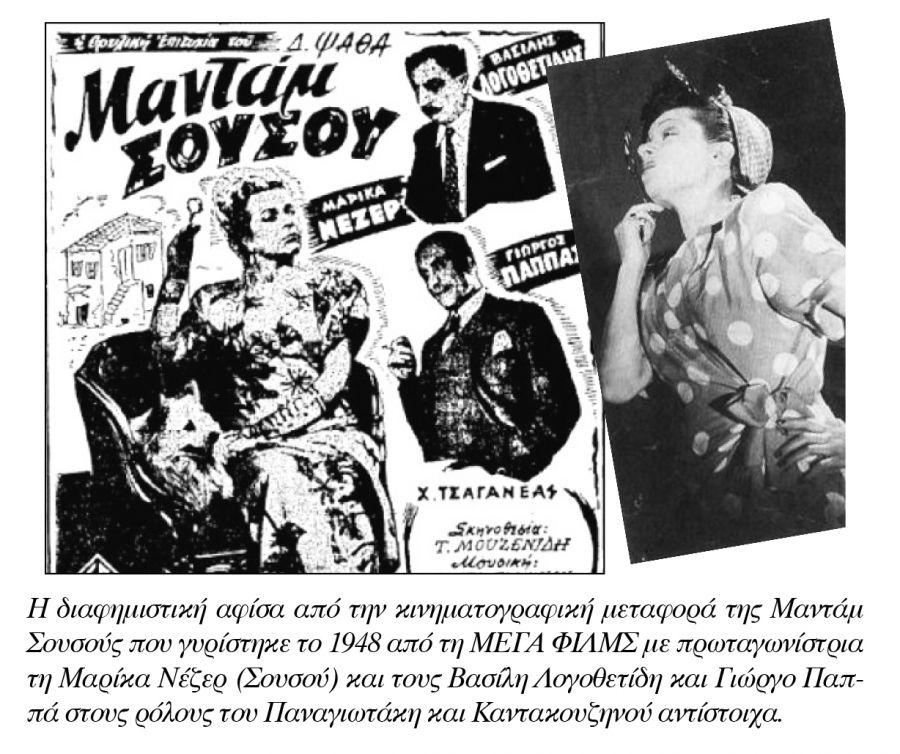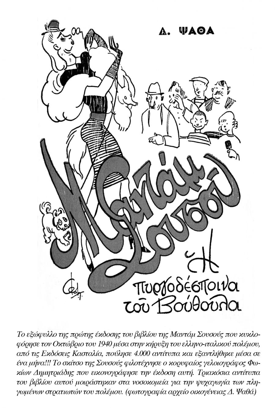 Η Μαντάμ Σουσού η μεγαλομανής και ακατάδεχτη ηρωίδα του Δημήτρη Ψαθά, που εισέβαλε δυναμικά στην ελληνική γλώσσα ως ρήμα και προσδιοριστικό επίθετο (σουσού, σουσουδίζω) ξεκίνησε ως ευθυμογράφημα στο προπολεμικό εβδομαδιαίο περιοδικό «Θησαυρός» (1939) έγινε βιβλίο (1940), τραγούδι (το 1940 σε μουσική Λεό Ραπίτη και το 1986 σε μουσική Διονύση Τσακνή), νούμερο κατοχικών επιθεωρήσεων (με την Μαρίκα Νέζερ 1940), πολεμική κάρτ ποστάλ με την Σουσού και τον Μουσολίνι (από τον κορυφαίο γελοιογράφο Φωκίωνα Δημητριάδη 1940), θεατρικό έργο (με τους Αιμίλιο Βεάκη και Κατερίνα Ανδρεάδη το 1942, με την Μαίρη Αρώνη το 1946, με την Άννα Παναγιωτοπούλου το 1998 και στο ΚΘΒΕ με την Φωτεινή Μπαξεβάνη το 2012), κινηματογραφική ταινία (με την Μαρίκα Νέζερ το 1948), ραδιοφωνική εκπομπή (με την Γεωργία Βασιλειάδου το 1950) και τηλεοπτικό σήριαλ (με την Άννα Παϊταζή και τον Δημήτρη Καλλιβωκά το 1972 και τέλος με την ΄Αννα Παναγιωτοπούλου και τον Θανάση Παπαγεωργίου το 1986).
