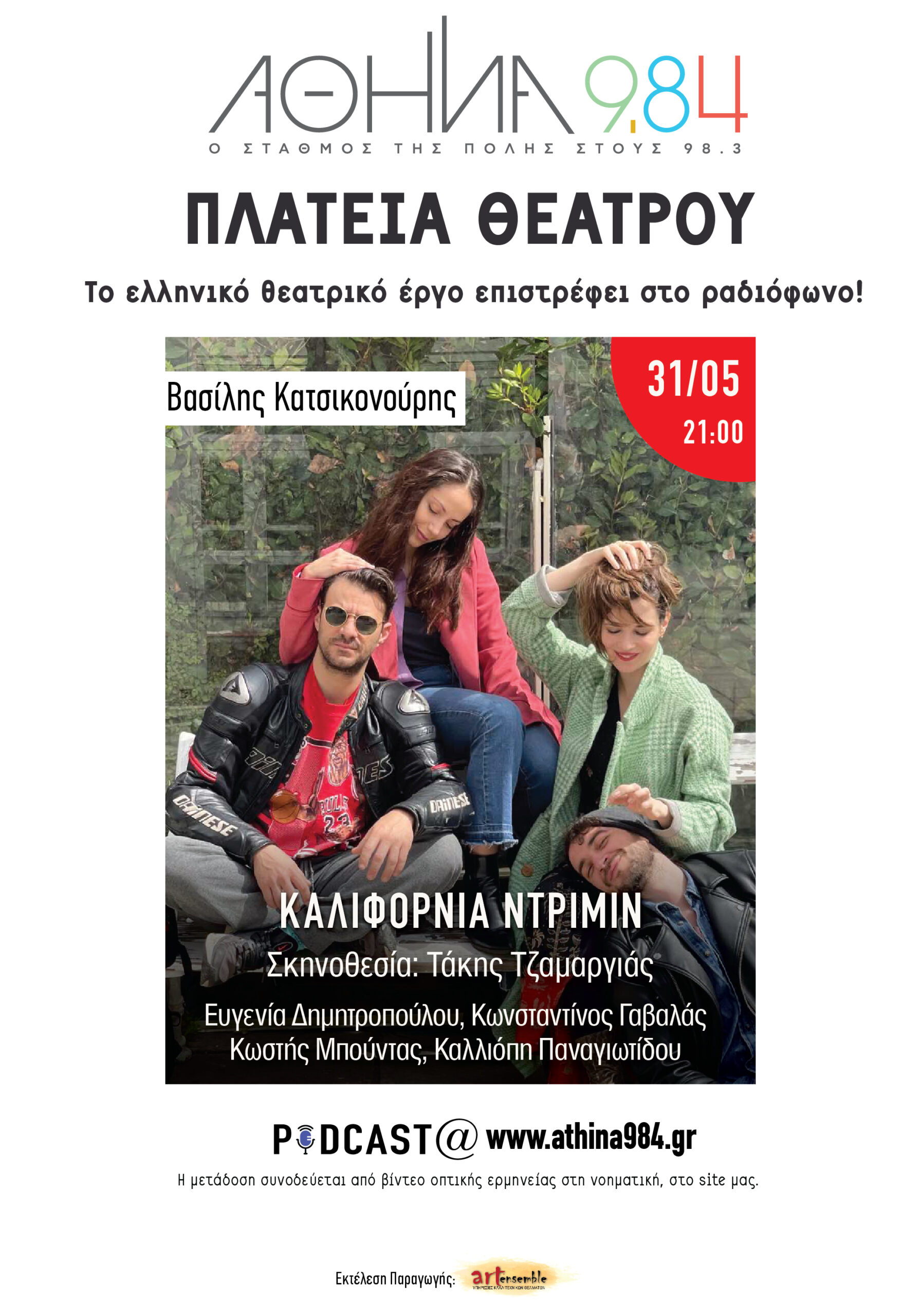 Τη Δευτέρα 31 Μαίου, στο πλαίσιο της «Πλατείας Θεάτρου», του Αθήνα 9.84, θα γίνει η ραδιοφωνική μετάδοση του έργου «Καλιφόρνια Ντρίμιν» του Βασίλη Κατσικονούρη, σε σκηνοθεσία Τάκη Τζαμαργιά και τη μουσική υπογράφει ο Πλάτων Ανδριτσάκης. Ακούγονται: ο Κωνσταντίνος Γαβαλάς, ο Κωστής Μπούντας, η Καλλιόπη Παναγιωτίδου και η Ευγενία Δημητροπούλου.