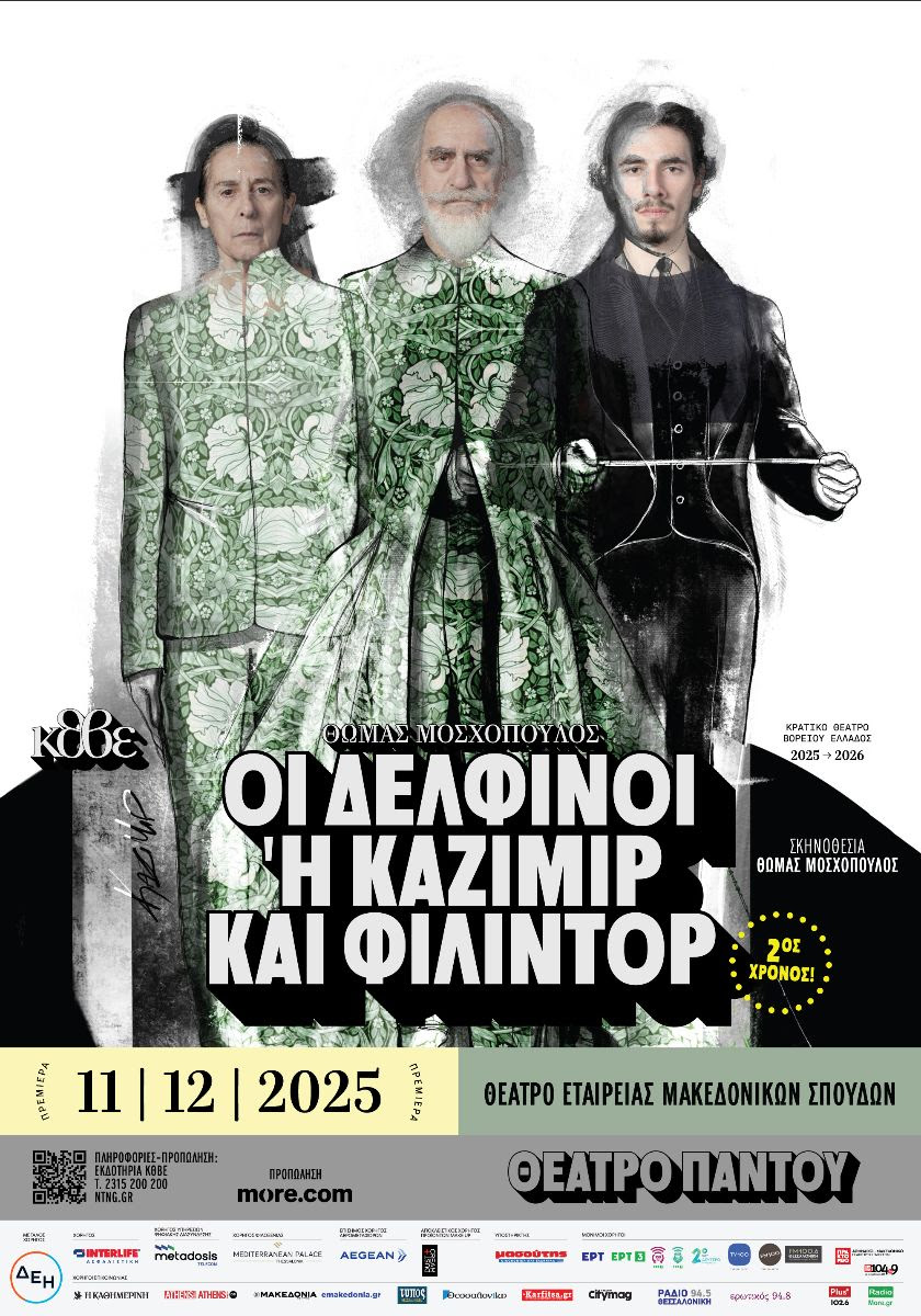 Θερμή υποδοχή για την επανέναρξη των παραστάσεων στο Κρατικό Θέατρο Βορείου Ελλάδος που σημείωσαν μεγάλη επιτυχία την περσινή σεζόν. Η παράσταση «Οι Δελφίνοι ή Καζιμίρ και Φιλιντόρ», που παρουσιάστηκε σε πανελλήνια πρώτη τον Μάιο στο ΚΘΒΕ συγκεντρώνοντας εξαιρετικές κριτικές και την προτίμηση του κοινού, επέστρεψε για 2η χρονιά και απέσπασε το πιο δυνατό χειροκρότημα στην κατάμεστη αίθουσα του Θεάτρου της Εταιρείας Μακεδονικών Σπουδών, το βράδυ της Πέμπτης στις 11 Δεκεμβρίου.