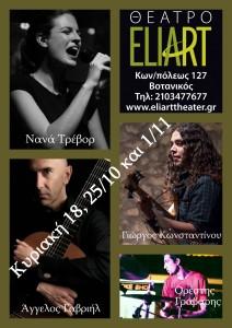 Τις Κυριακές 25 Οκτωβρίου και 1η Νοεμβρίου στο θέατρο Eliart η τραγουδίστρια Νανά Τρέβορ, ο κιθαρίστας Άγγελος Γαβριήλ, ο μπασίστας Γιώργος Κωνσταντίνου και ο ντράμερ Ορέστης Γράβαρης, θα παρουσιάζουν ένα πρόγραμμα με γνωστά jazz standards που ...