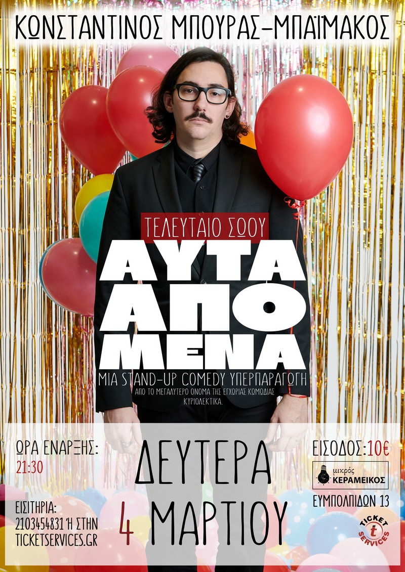 Μια stand-up comedy υπερπαραγωγή, από το μεγαλύτερο όνομα της εγχώριας κωμωδίας. Κυριολεκτικά. Μετά από 9 χρόνια ενασχόλησης με την κωμωδία, τα καλύτερα κείμενα του Κωνσταντίνου Μπούρα-Μπαϊμάκου μαζεμένα σε μια παράσταση. Με ευθύ και άμεσο ...
