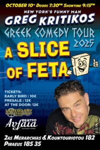 Ο Ελληνοαμερικάνος Stand-up κωμικός Greg Kritikos Greg Kritikos brings his hit show “ A SLICE OF FETA ” to Piraeus! One night only of English stand-up at Θέατρο Αυλαία!