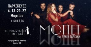 Οι Mottet & η Ξένια Γαργάλη, μετά τις επιτυχημένες εμφανίσεις τους σε μουσικές σκηνές της Αθήνας, επιστρέφουν στο αγαπημένο τους στέκι, το El Convento de l’ Arte για όλες τις Παρασκευές του Μαρτίου.
