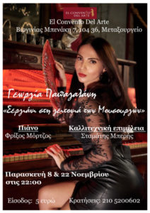 Η νεαρή ερμηνεύτρια Γεωργία Παπαγαλάνη έρχεται για δύο μοναδικές βραδιές με τίτλο «Σεργιάνι στη γειτονιά των μουσουργών» στο El Convento Del Arte, στις 8 & 22 Νοεμβρίου, για να ερμηνεύσει τραγούδια όπως το "Μη τον ρωτάς τον ουρανό", "Τι είναι ...
