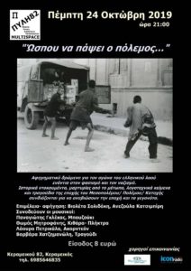 Την Πέμπτη 24 Οκτωβρίου 2019 και ώρα 9 μ. μ. πραγματοποιείται η αφηγηματική παράσταση μετά μουσικής, με τίτλο ΄Ωσπου να πάψει ο πόλεμος… στον πολυχώρο Πύλη 82, Κεραμεικού 82, Κεραμεικός .