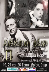 Η Εταιρεία παραγωγής θεατρικών παραστάσεων AnasaArt παρουσιάζει το εμβληματικό μονόπρακτο του Ζαν Κοκτώ, ΑΝΘΡΩΠΙΝΗ ΦΩΝΗ για 3 μόνο παραστάσεις στο θέατρο Παραμυθίας, Πέμπτη 19, 21 και 26 Σεπτεμβρίου στις 21:00.