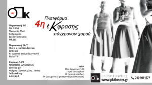 Το Θέατρο ΠΚ για 4η συνεχόμενη χρονιά διοργανώνει την Πλατφόρμα Έκφρασης Σύγχρονου Χορού δίνοντας βήμα σε νέους καλλιτέχνες να παρουσιάσουν στο κοινό τα έργα τους και τις ιδέες τους. Στο πλαίσιο αυτού του θεσμού, ο χώρος του θεάτρου ΠΚ κάθε ...