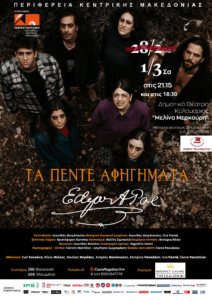 Tο Κέντρο Πολιτισμού Περιφέρειας Κεντρικής Μακεδονίας παρουσιάζει την θεατρική παράσταση «Τα πέντε αφηγήματα του Edgar Allan Poe» το Σάββατο 1 Μαρτίου στις 18:30 & 21:15 στο Δημοτικό Θέατρο Καλαμαριάς «Μελίνα Μερκούρη».