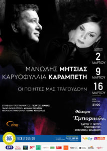 Μια ανθολογία της ελληνικής μελοποιημένης ποίησης από την Σαπφώ στον Σολωμό , τον Σεφέρη, τον Ελύτη και τον Ρίτσο, με τον ΜΑΝΩΛΗ ΜΗΤΣΙΑ και την ΚΑΡΥΟΦΥΛΛΙΑ ΚΑΡΑΜΠΕΤΗ