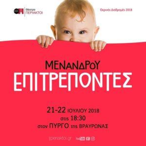 ΠΡΟΓΡΜΜΑ ΠΕΡΙΟΔΕΙΑΣ Αναγεννησιακός Πύργος Βραυρώνας. > 21 & 22 Ιουλίου 2018 - 18:30 Θέατρο Σάρας Μαρκοπούλου. > 31 Αυγούστου 2018 - 21:00 Το Θέατρο ΠΕΡΙΑΚΤΟΙ, με έναν οκταμελή θίασο, παρουσιάζει την κωμωδία του ...