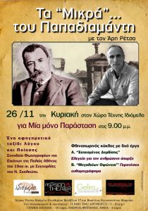 Ένα αφηγηματικό ταξίδι Λόγου και Ποίησης υπό το «βλέμμα» του Παπαδιαμάντη και την φωνή του Άρη Ρέτσου, συνοδεία Φωτογραφιών και Εικόνων της Παλιάς Αθήνας του 19ου αι. με τις Συγχορδίες του Ν. Σκαλκώτα.