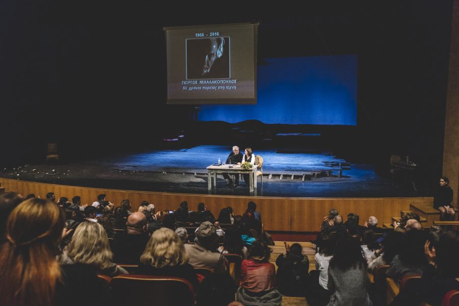 Κατά τη διάρκεια της συζήτησης την οποία συντόνισε η Μαρία Τσιμά, Αναπληρώτρια Καλλιτεχνική Διευθύντρια του ΚΘΒΕ, ο Γιώργος Μιχαλακόπουλος αποκάλυψε λεπτομέρειες για το ξεκίνημα της καριέρας του και τη διαδρομή 60 χρόνων στο θέατρο, τον κινηματογράφο και την τηλεόραση. Με το λεπτό χιούμορ του μετέφερε το κοινό στα παρασκήνια του Υπογείου του Θεάτρου Τέχνης, μίλησε για σκηνοθέτες που έχει συνεργαστεί και στάθηκε στη μοναδική προσωπικότητα του Καρόλου Κουν, μια πραγματική «φλεγόμενη βάτο» όπως χαρακτηριστικά τον αποκάλεσε, καθώς και στον Μίνω Βολανάκη και τον Αντρέα Βουτσινά ο οποίος τον σκηνοθέτησε στην παράσταση του Εθνικού Θεάτρου «Η Τρέλα του Γεωργίου του Γ’», που παρουσιάστηκε στη σκηνή της Εταιρείας Μακεδονικών Σπουδών, το 1994.