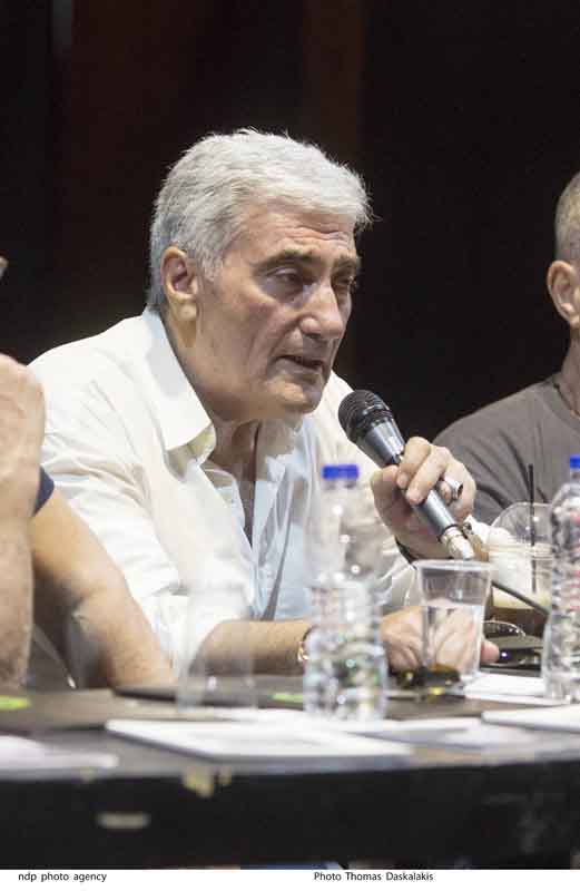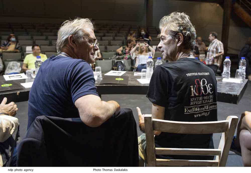«Η συνάντησή μας είναι πάρα πολύ ωραία γι’ αυτό το έργο. Από τις πρόβες ακόμη, υπήρξε μια συνεννόηση μια ταύτιση απόψεων και συνεχίζεται και επί σκηνής», είπε ο Χρήστος Στέργιογλου ο οποίος πρωταγωνιστεί στην παράσταση. «Εμείς κινούμαστε, κινείται και η παράστασή μας, είναι εν εξελίξει», συνέχισε και τόνισε ότι «πάντα διαβάζοντας και ξαναδιαβάζοντας τον αριστοφανικό λόγο, βρίσκουμε κάτι νέο να μας συναρπάσει. Κάτι που σε ξαφνιάζει, που σε προβληματίζει ευχάριστα. Για αυτό και λέω πως δε σταματά ποτέ ο δρόμος τούτος. Κι είναι διάχυτη η συναισθηματική φόρτιση για την παράσταση λόγω του Γιάννη Ρήγα που είναι σώμα απ’ το σώμα του Κάρολου Κουν, μια δεύτερη με το εμβληματικό κοστούμι του Τσαρούχη που μας παραχωρήθηκε ευγενώς από το Θέατρο Τέχνης και φυσικά ο Χατζιδάκις που είναι παρόν στο έργο. Φτιάξαμε όλοι μαζί ένα ωραίο λαϊκό θέατρο».