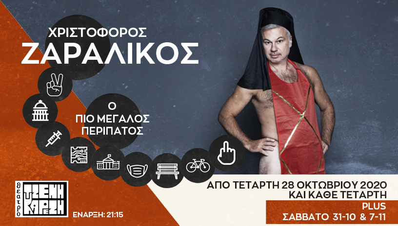 Ο Χριστόφορος Ζαραλίκος ως άλλος Προφήτης, σας καλεί να τον ακολουθήσετε στον πιο Μεγάλο Περίπατο, άμεσα, άκοπα και κυρίως αβάδιστα. Απογυμνωμένος από κάθε στερεότυπο και προκατάληψη, καταλήγει δίπλα στην Βουλή, στο Θέατρο Τζένη Καρέζη, όπου για σας μανάρια του και μόνο, στήνει μια όαση σάτιρας και κάνει την επισκόπηση των πολιτικό-κοινωνικών φαινομένων με χιούμορ κι οξυδέρκεια. Απαντάει σε όλα τα καυτά ερωτήματα της επικαιρότητας και λύνει γρίφους όπως: