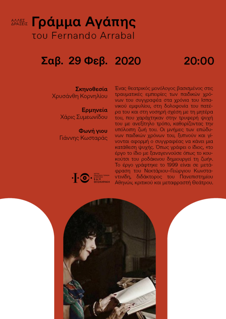 Λόγω της μεγάλης επιτυχίας που σημείωσε και εξακολουθεί να σημειώνει, η παράσταση Γράμμα Αγάπης του Φερνάντο Αρραμπάλ προσκλήθηκε από το Ίδρυμα Εικαστικών Τεχνών και Μουσικής Β & Μ Θεοχαράκη και πρόκειται να παρουσιαστεί στην υπέροχη αίθουσά του στις 29 Φεβρουαρίου στις 20:00