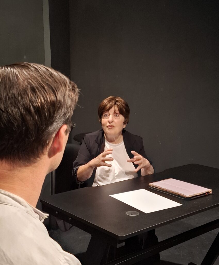 Μέσα από μια υποδειγματικά ‘πολιτισμένη’ συζήτηση, η Διευθύντρια αναφερόμενη στις κατασταλτικές ικανότητες της μηχανής Τζακ Ρίπερ, καταφέρνει να νουθετήσει τον Νέο Σκηνοθέτη ώστε από τα ‘φληναφήματά’ του περί δολοφονημένων να επανέλθει στην καλλιτεχνική του ‘αυτογνωσία’ και να παραδεχτεί πως : Η Θεριζοαλωνιστική Μηχανή Τζακ Ρίπερ είναι η πεμπτουσία της Δημοκρατίας και η Τέχνη υπάρχει για να μας οδηγήσει στην ‘άρρητη μετα-ανθρώπινη παραίσθηση’ μέσα από ‘τις τρεμάμενες αντανακλάσεις της Μνημοσύνης’..