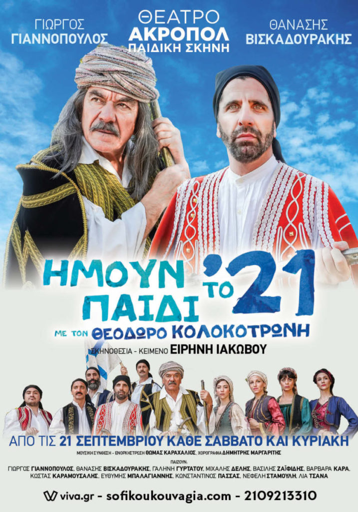 Μετά από το «Ένα παιδί μετράει τ’ άστρα» που αγαπήθηκε ιδιαίτερα από τους μικρούς και μεγάλους θεατές, η σκηνοθέτης Ειρήνη Ιακώβου εμπνέεται από τον ηρωικό ξεσηκωμό του 1821 και παρουσιάζει τη νέα της παράσταση «Ήμουν παιδί το ’21 με τον Θεόδωρο Κολοκοτρώνη» κάθε Σάββατο και Κυριακή από τις 28 Σεπτεμβρίου, στο Θέατρο Ακροπόλ.