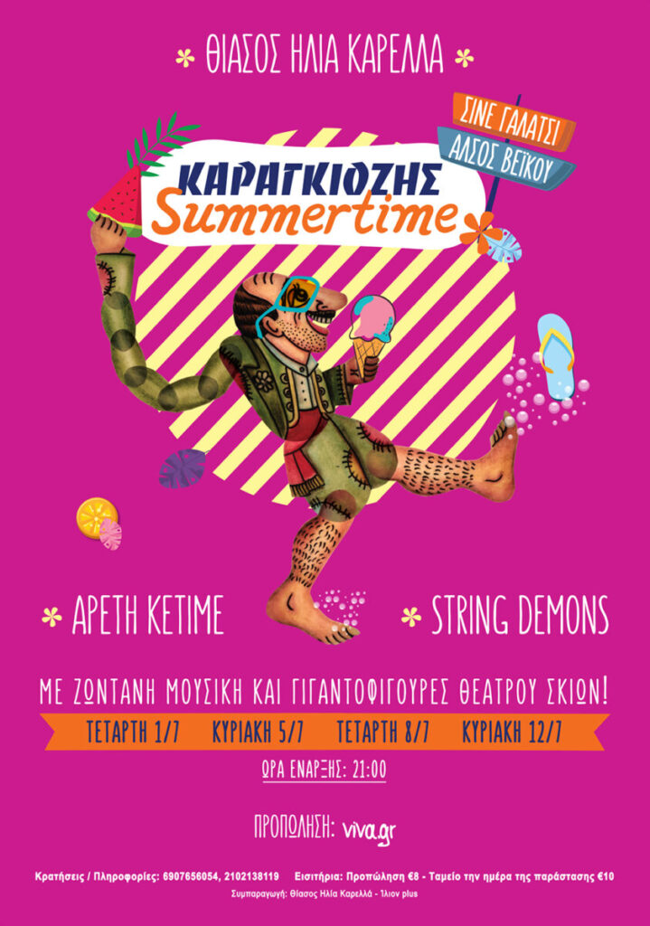Ο γνωστός σκιοπαίκτης και σκηνοθέτης Ηλίας Καρελλάς, μετά τις sold out παραστάσεις του στο Μέγαρο Μουσικής Αθηνών και στο Θέατρο Κάππα, αντλώντας έμπνευση από τις κλασικές παραστάσεις του Θεάτρου Σκιών και φυσικά την επικαιρότητα, δημιουργεί μια ολοκαίνουργια καλοκαιρινή μουσική κωμωδία με πρωταγωνιστή τον Καραγκιόζη. Μια παράσταση με ζωντανή μουσική, γιγαντοφιγούρες Θεάτρου Σκιών και τις ξεκαρδιστικότερες ατάκες του πιο αγαπημένου ήρωα μικρών και μεγάλων!
