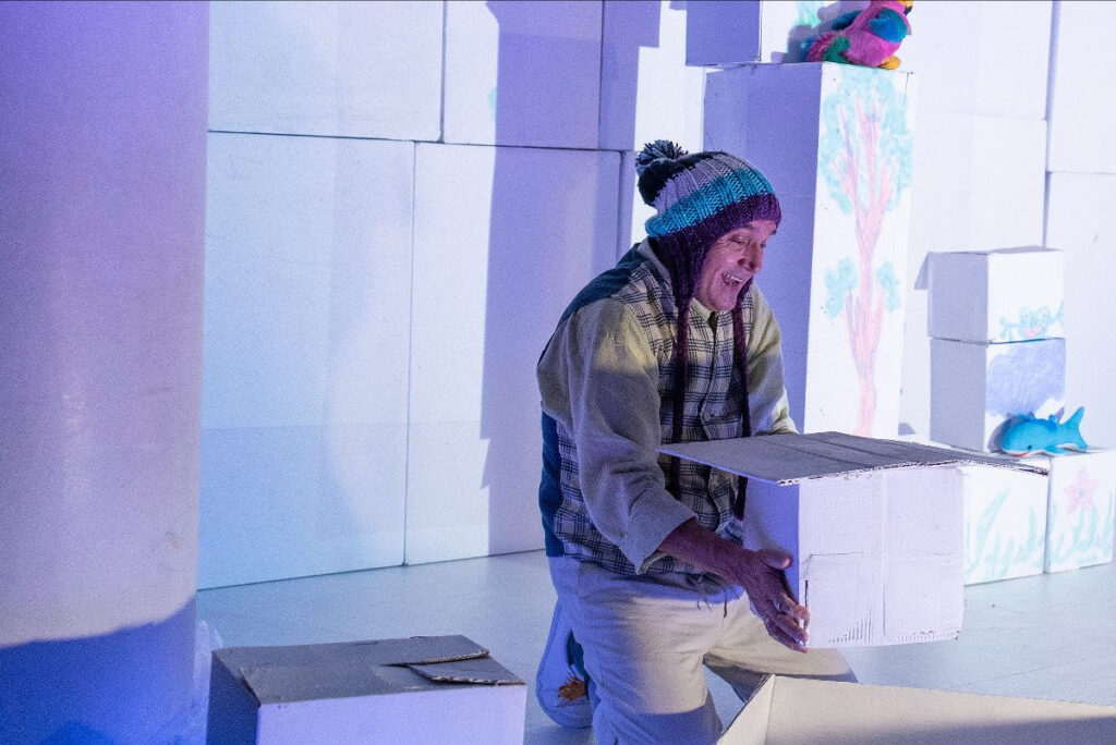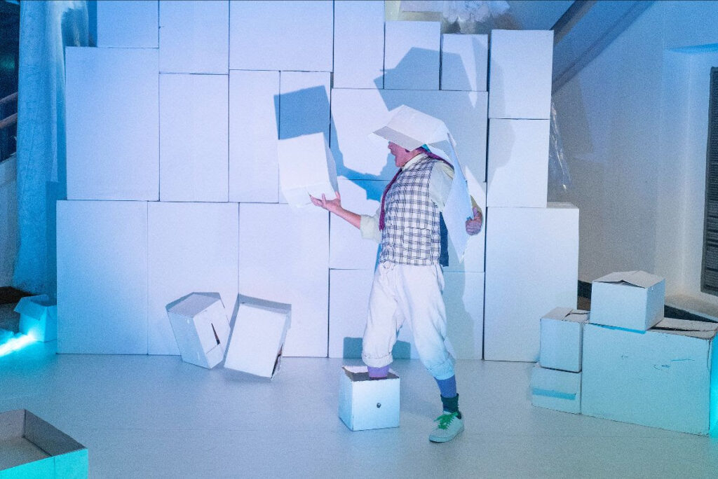 Ένα ανθρωπάκι βρίσκεται ανάμεσα σε λευκά χαρτόκουτα. Όταν προκύψει η ανάγκη να φτιάξει σπιτάκια για το ίδιο αλλά και τους φίλους του, ένας ολόκληρος κόσμος ξετυλίγεται μπροστά του, αφού με τη φαντασία του τα κουτιά αποκτούν χρώμα, μορφή, κίνηση. Η παράσταση υπενθυμίζει την ανάγκη κάθε πλάσματος να φτιάξει τη φωλίτσα του, να κατοικήσει το δικό του «σπίτι» και τελικά να νιώσει ασφάλεια στο καταφύγιο που πλάθει μέσα στον μεγάλο κόσμο.