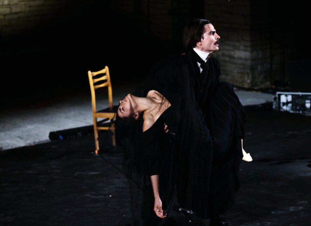 Η παράσταση βασίζεται στην πρώτη ελληνική μετάφραση του έργου από τον Νικόλαο Σπανδωνή, στην καθαρεύουσα των αρχών του 20ού αιώνα. Η γλώσσα λειτουργεί ως διαμεσολαβητής των κρυμμένων μυστικών της τέχνης, του ύφους και της εποχής του Πόε. Η ποιητική πυκνότητα και η τελετουργική υφή της φέρνουν στην επιφάνεια την αφηρημένη σύλληψη μιας ιδιωτικής εμπειρίας που στην οριακή της ένταση γίνεται παγκόσμια, το «ασύλληπτο» δηλαδή της ανθρώπινης τραγωδίας.