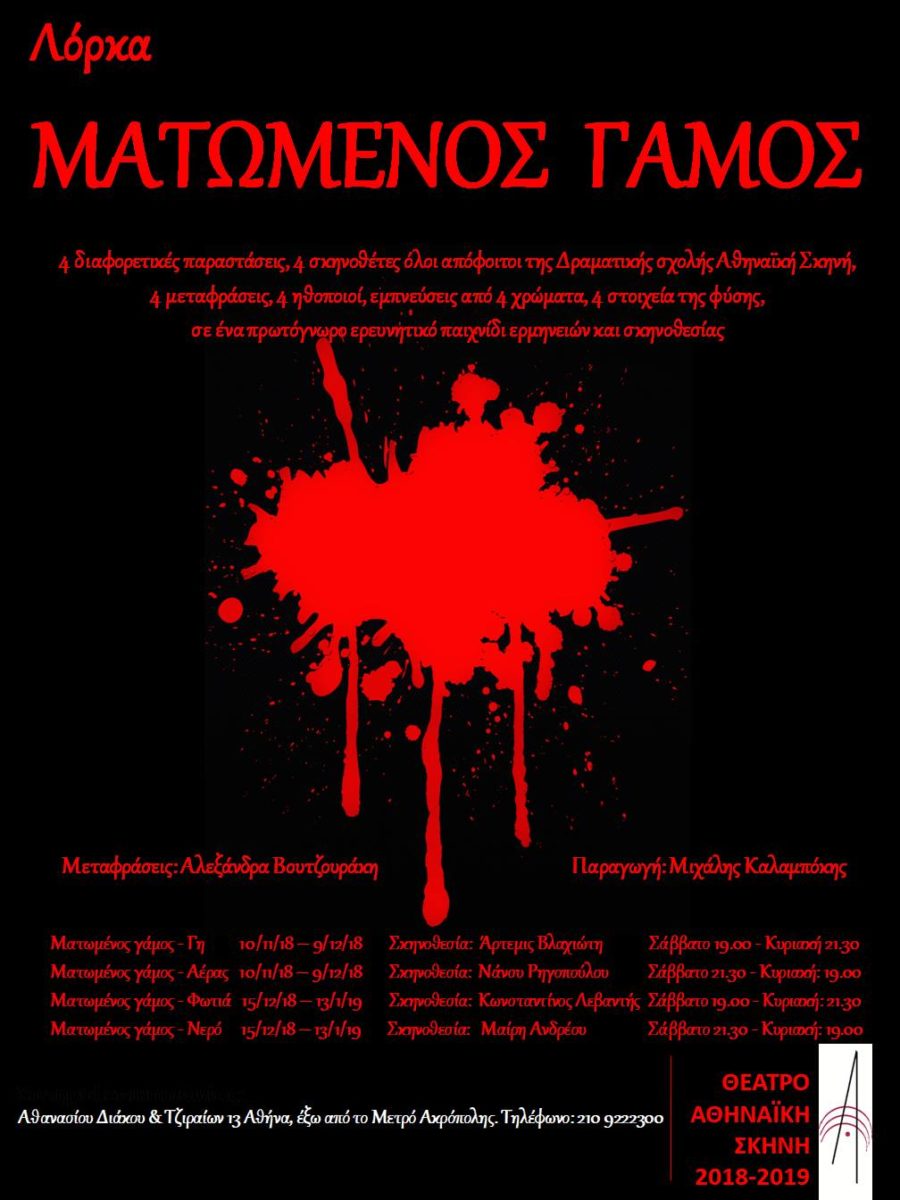 Τέσσερις νέοι σκηνοθέτες, όλοι απόφοιτοι της Ανώτερης Δραματικής Σχολής της Αθηναϊκής Σκηνής, θα παρουσιάσουν τέσσερις διαφορετικές εκδοχές, τέσσερις διαφορετικές σκηνοθετικές ματιές του έργου «Ο Ματωμένος Γάμος» του Φεντερίκο Γκαρθία Λόρκα.