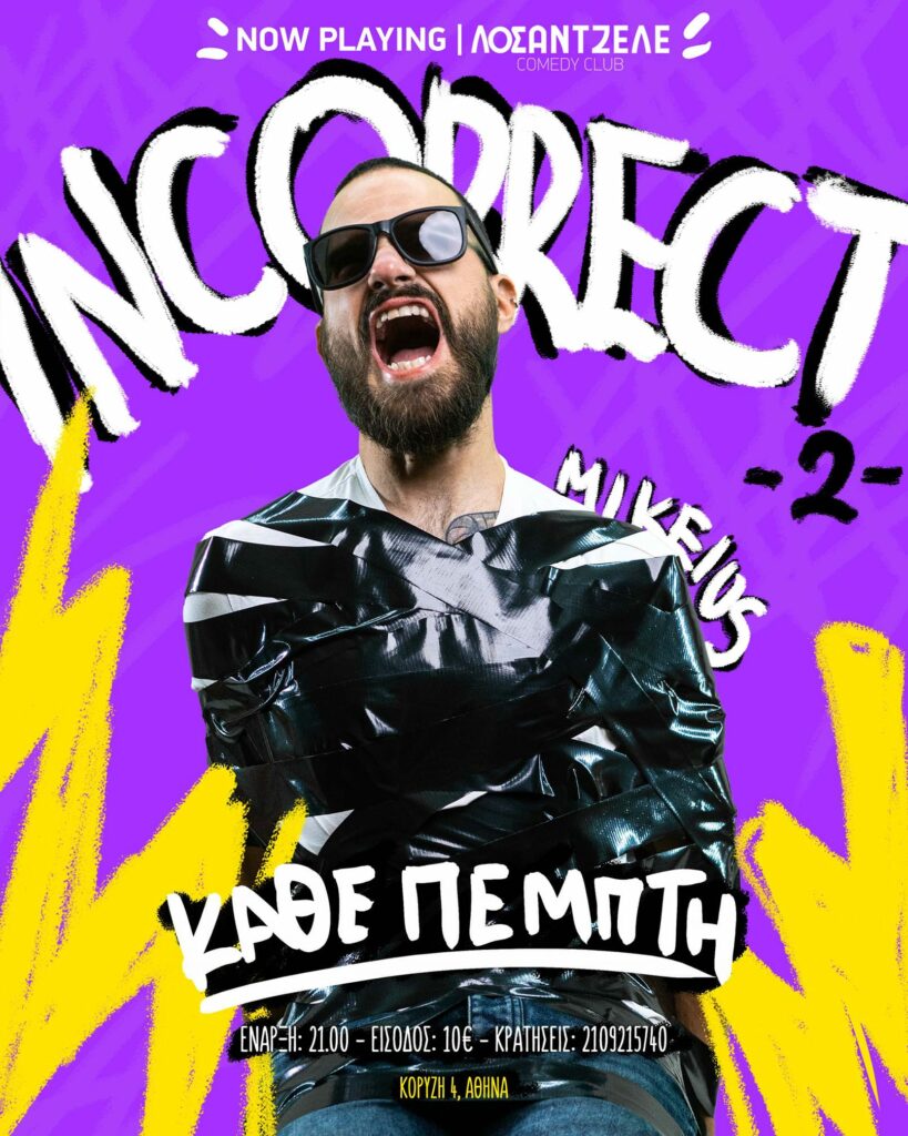 Ινκορεκτ γιατί πάνε όλα λάθος.Σχέσεις, καριέρα και καθημερινά προβλήματα σχολιάζονται με τον πιο αφοπλιστικά ευθύ τρόπο σε μία παράσταση που θα σας λυγίσει στα γέλια !!