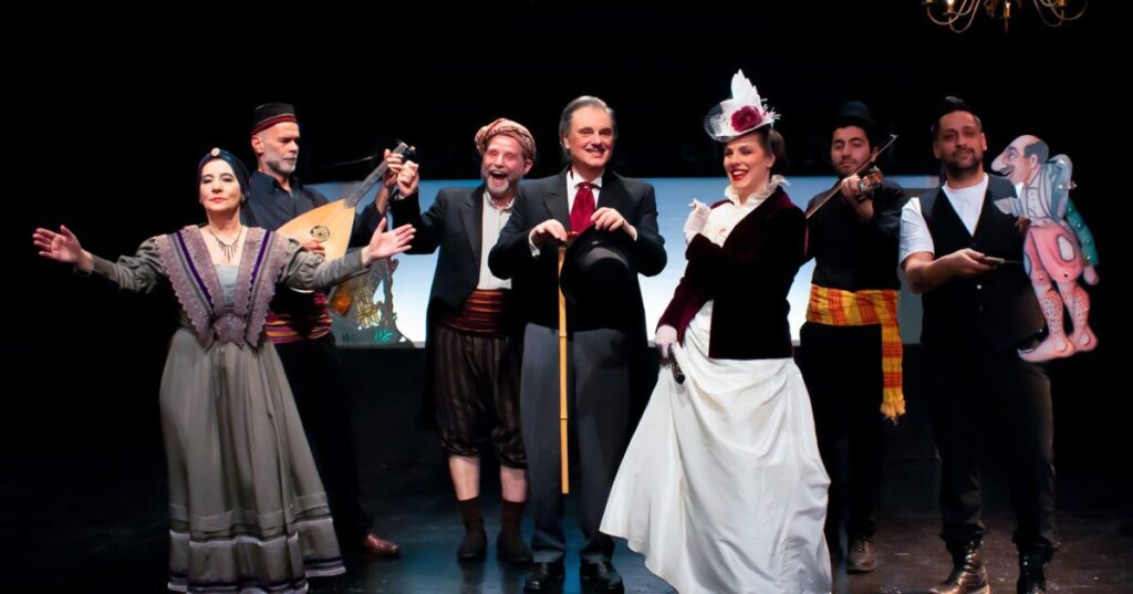 Ερμηνεύουν: Γιώργος Γαλίτης, Άννα Ελεφάντη, Δημήτρης Μυλωνάς, Φώτης Τσορανίδης, Ιλιάδα Λαμπρίδου, Στην παράσταση συμμετέχει ζωντανά ο καραγκιοζοπαίχτης Κώστας Σπυρόπουλος. Βοηθοί στο μπερντέ, οι μαθητές της Ακαδημίας Θεάτρου Σκιών «Θανάσης Σπυρόπουλος».