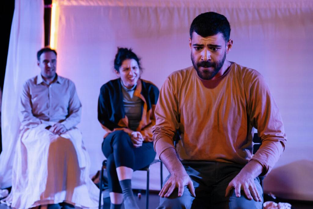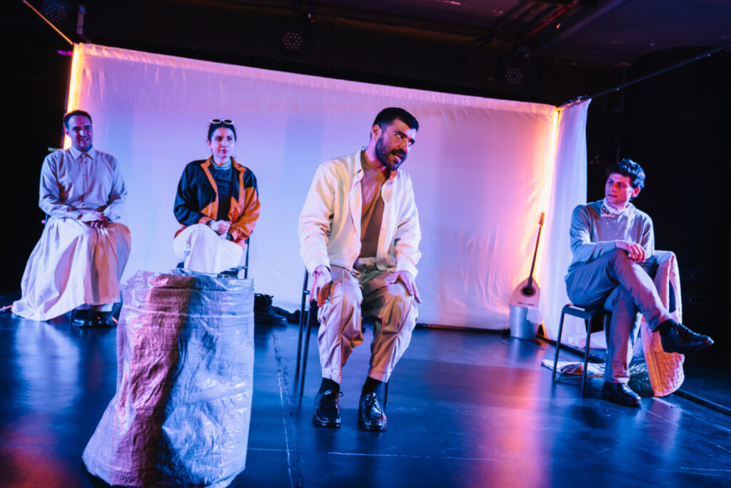 Οι ηθοποιοί: Φίλιππος Κοντογιώργης, Θανάσης Λυσανδρόπουλος, Σταύρια Νικολάου και Γρηγόρης Πανταζής, εναλλάσσονται σε όλους τους ρόλους του έργου, δίνοντας την αίσθηση ότι βιώνουν όλα τα γεγονότα της ζωής τους στις τέσσερις γωνίες μιας αυλής ενός αγροτικού σπιτιού.