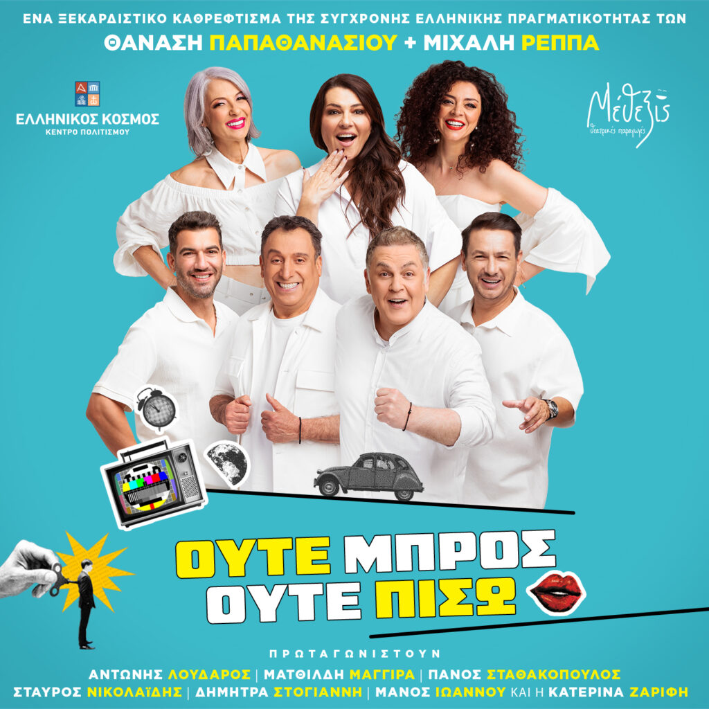 Το Ίδρυμα Μείζονος Ελληνισμού, μετά την τεράστια επιτυχία της καλοκαιρινής περιοδείας, υποδέχεται τη νέα σατιρική κωμωδία «Ούτε μπρος ούτε πίσω» των Θανάση Παπαθανασίου και Μιχάλη Ρέππα, σε παραγωγή της εταιρείας Μέθεξις του Χρήστου Τριπόδη. Πρωταγωνιστούν: Αντώνης Λουδάρος, Ματθίλδη Μαγγίρα, Πάνος Σταθακόπουλος, Σταύρος Νικολαΐδης, Δήμητρα Στογιάννη, Μάνος Ιωάννου και η Κατερίνα Ζαρίφη.