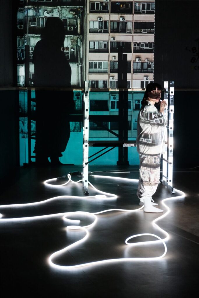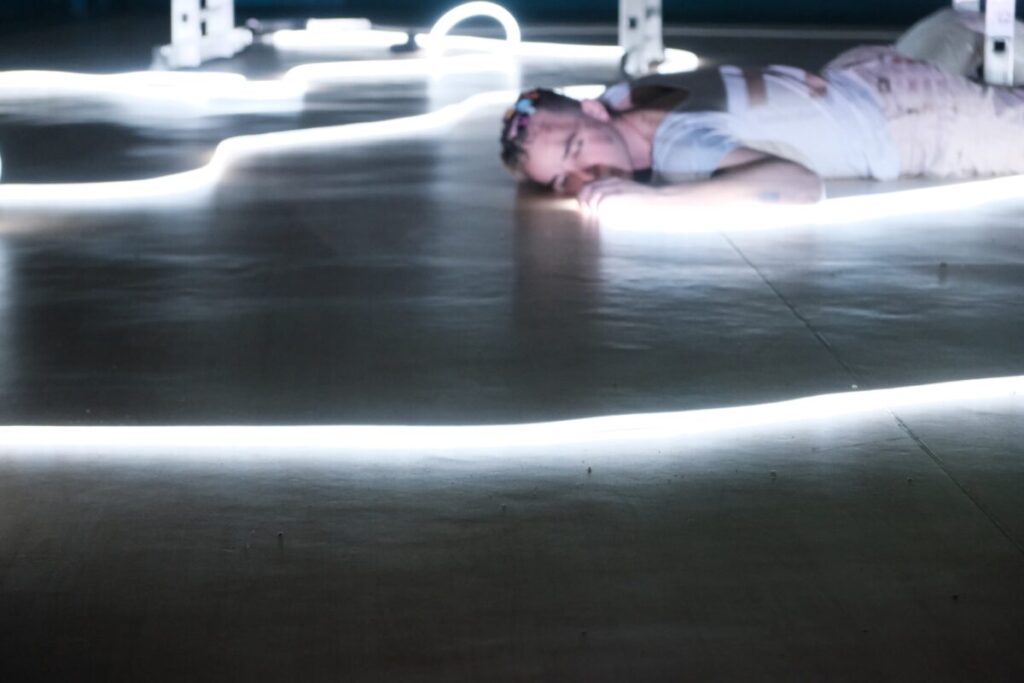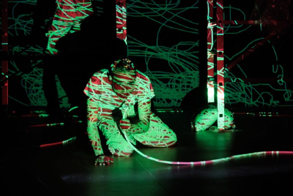 Στις «Πεταλούδες στο στομάχι» η σκηνή δεν φωτίζεται, ζωγραφίζεται. Αντί συμβατικών φωτιστικών σωμάτων, η ατμόσφαιρα δημιουργείται μέσω προτζέκτορα και ψηφιακού προγράμματος ζωγραφικής που λειτουργεί ζωντανά επί σκηνής. Η εικόνα παράγεται σε πραγματικό χρόνο και προβάλλεται πάνω στα σώματα των ηθοποιών, μετατρέποντάς τα σε κινούμενα έργα τέχνης. Το περίγραμμα της φαντασίωσης σχεδιάζεται μπροστά στο κοινό και αποκτά χρώμα, ένταση και μορφή τη στιγμή που συμβαίνει. Τα πρόσωπα εξιδανικεύονται, αλλοιώνονται, αποδομούνται και επανασυντίθενται, όπως ακριβώς συμβαίνει και στον έρωτα. Η μουσική, σαν να ξεπηδά από κασέτες μνήμης, μεταφέρει ήχους του παρελθόντος στο παρόν και συντονίζει ρυθμικά την εικόνα, δημιουργώντας ένα πολυεπίπεδο οπτικοακουστικό περιβάλλον.