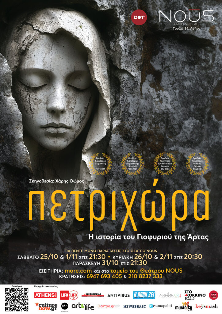 Η παράσταση που ξεχώρισαν στη Θεσσαλονίκη τον περασμένο χειμώνα κοινό, κριτικοί και εκπαιδευτικοί, και κατάφερε μέσα σε λίγους μόνο μήνες να αποσπάσει 2 διεθνή και 2 εγχώρια βραβεία, παρουσιάζεται για πρώτη φορά στην Αθήνα, στο Θέατρο Noūs - Creative space. Η «Πετριχώρα» ή αλλιώς η ιστορία του γιοφυριού της Άρτας, μια παραγωγή της Εταιρείας Θεάτρου DOT Ensemble, σε σκηνοθεσία Χάρη Θώμου, έρχεται στην Αθήνα για 5 μόνο παραστάσεις με τον 9μελή θίασό της.