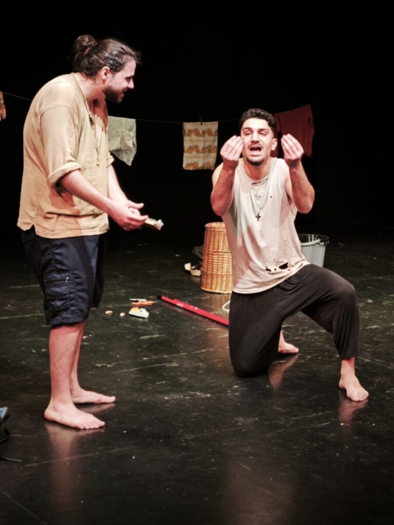 Η παράσταση συστήνει στους μικρούς θεατές μια περιπετειώδη ιστορία δύο απίθανων ναυαγών σε έναν κόσμο, όπου η φαντασία, το χιούμορ και η ευρηματικότητα κυριαρχούν.