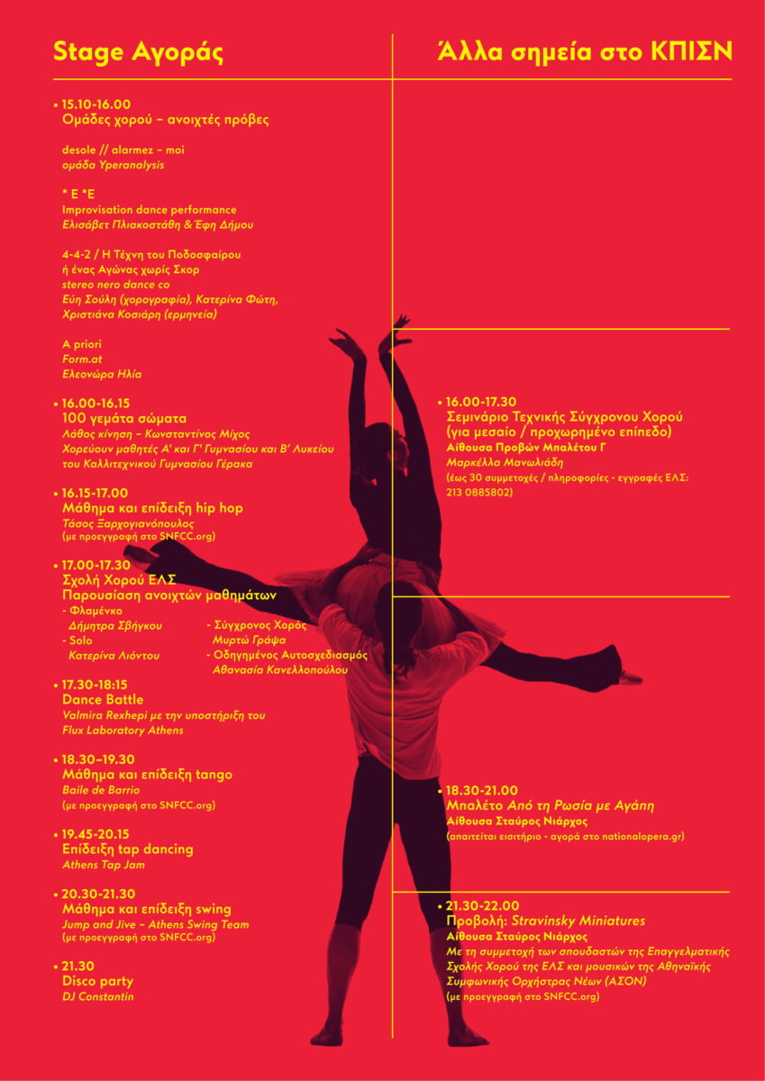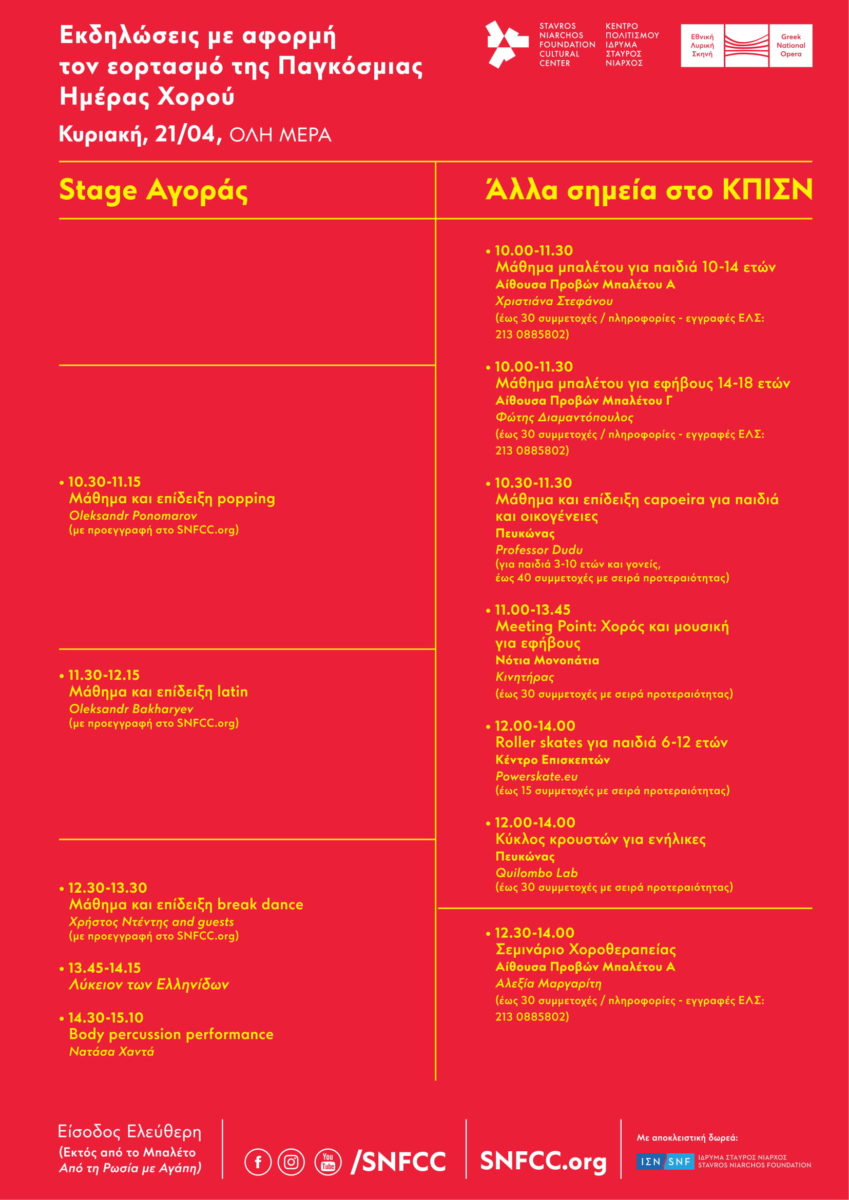 Με αφορμή τον εορτασμό της Παγκόσμιας Ημέρας Χορού 2019, το Κέντρο Πολιτισμού Ίδρυμα Σταύρος Νιάρχος (ΚΠΙΣΝ) και η Εθνική Λυρική Σκηνή (ΕΛΣ) σας προσκαλούν την Κυριακή 21 Απριλίου σε έναν ολοήμερο μαραθώνιο χορευτικών εκδηλώσεων. Μαθήματα αλλά και επιδείξεις capoeira, popping, latin, breakdance, tango, tap dancing και swing, μαθήματα μπαλέτου για παιδιά και εφήβους, ελληνικοί παραδοσιακοί χοροί από το Λύκειο Ελληνίδων, battles ανάμεσα σε διαφορετικά είδη χορού, σεμινάρια χοροθεραπείας και τεχνικής σύγχρονου χορού, επιδείξεις από τη Σχολή Χορού της ΕΛΣ και ομάδες χορού, θα πραγματοποιούνται σε διαφορετικά σημεία στο ΚΠΙΣΝ από τις 10 το πρωί έως τα μεσάνυχτα.