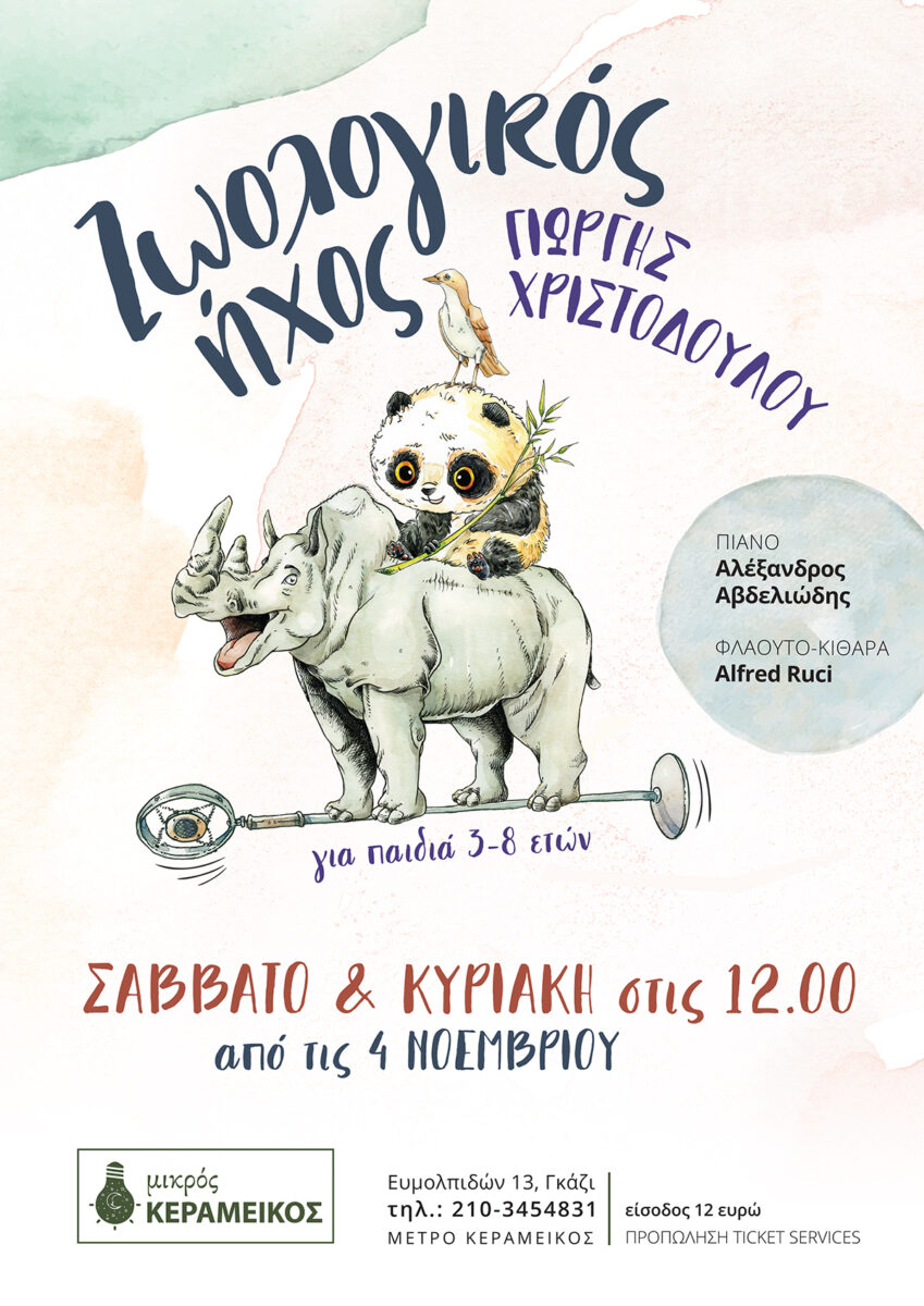 Ο Γιώργης Χριστοδούλου και οι συνεργάτες του σας περιμένουν από το Σάββατο 4 Νοεμβρίου και κάθε Σάββατο και Κυριακή στις 12 το μεσημέρι στον ΜΙΚΡΟ ΚΕΡΑΜΕΙΚΟ στο Γκάζι, όπου παρουσιάζουν την πρωτότυπη παράσταση για μικρούς και μεγάλους «ΖΩΟΛΟΓΙΚΟΣ ΗΧΟΣ»,με τα πιο όμορφα παιδικά τραγούδια για ζώα, που έχουν γραφτεί ποτέ στην ελληνική γλώσσα.