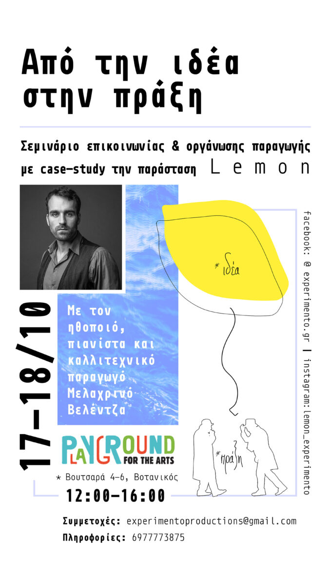 Μέσα από πρακτικά παραδείγματα της πορείας της sold-out παράστασης Lemon από το 2018 μέχρι σήμερα, θα επικεντρωθούμε στα χρήσιμα εργαλεία που είναι απαραίτητα για την επικοινωνία και την οργάνωση παραγωγής προσαρμόζοντάς τα στις ανάγκες των συμμετεχόντων και τις δικές τους ιδέες και επιθυμίες.