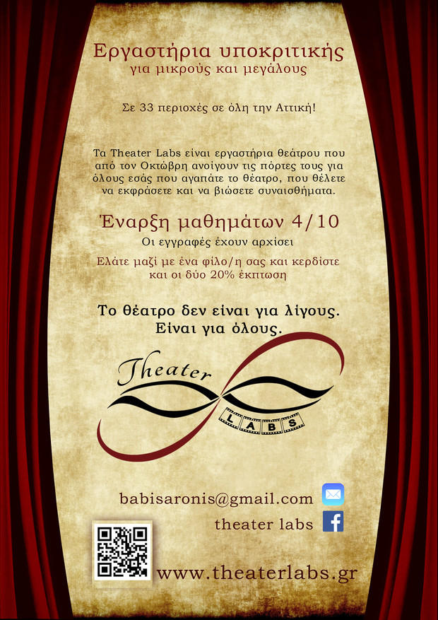 Τα θεατρικά εργαστήρια Theater Labs ανοίγουν φέτος τις πόρτες τους σε όλη την Αττική. Έχοντας στο δυναμικό τους 33 ομάδες, είναι σίγουρο πως μία από αυτές είναι κοντά σας.