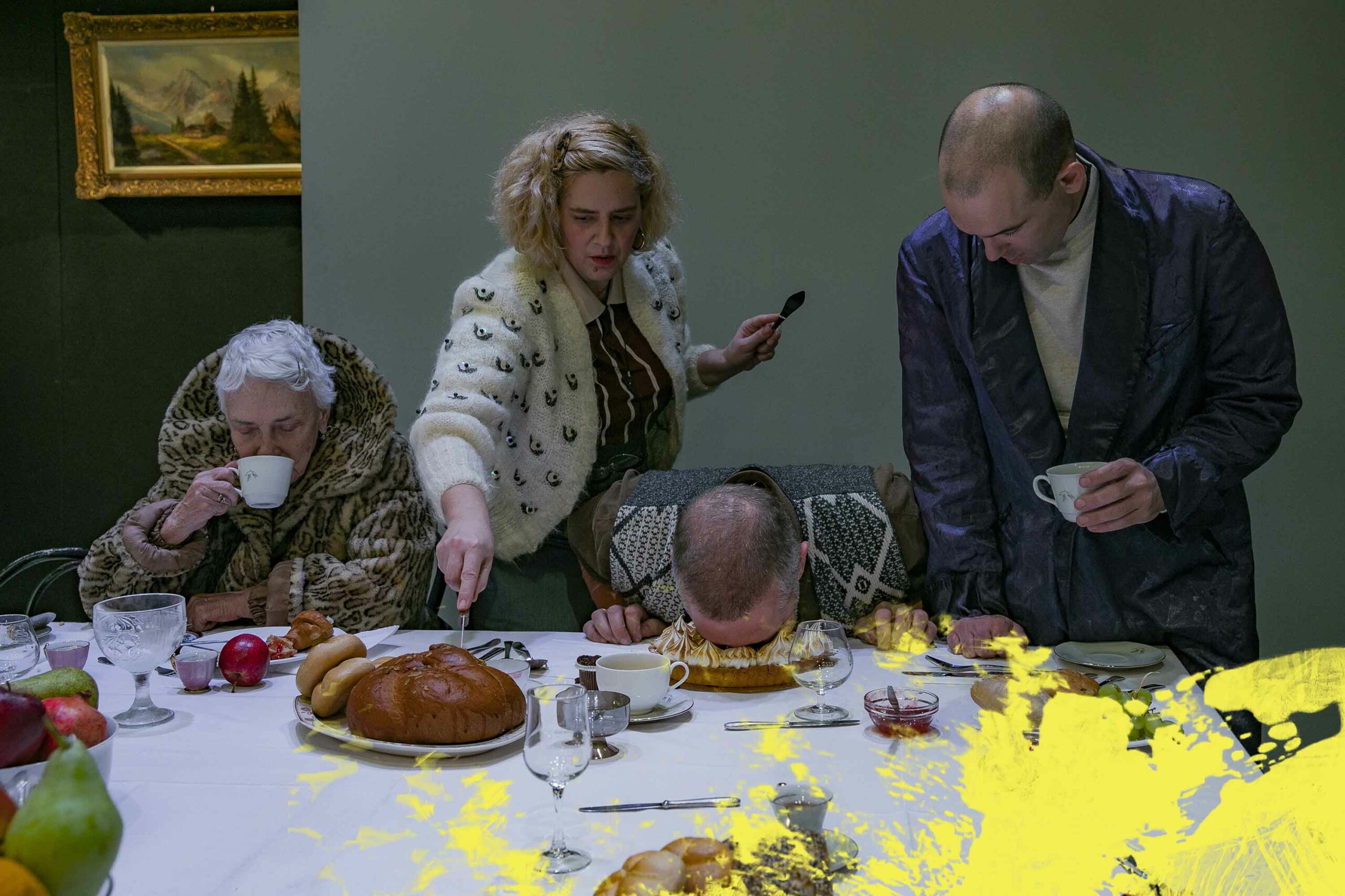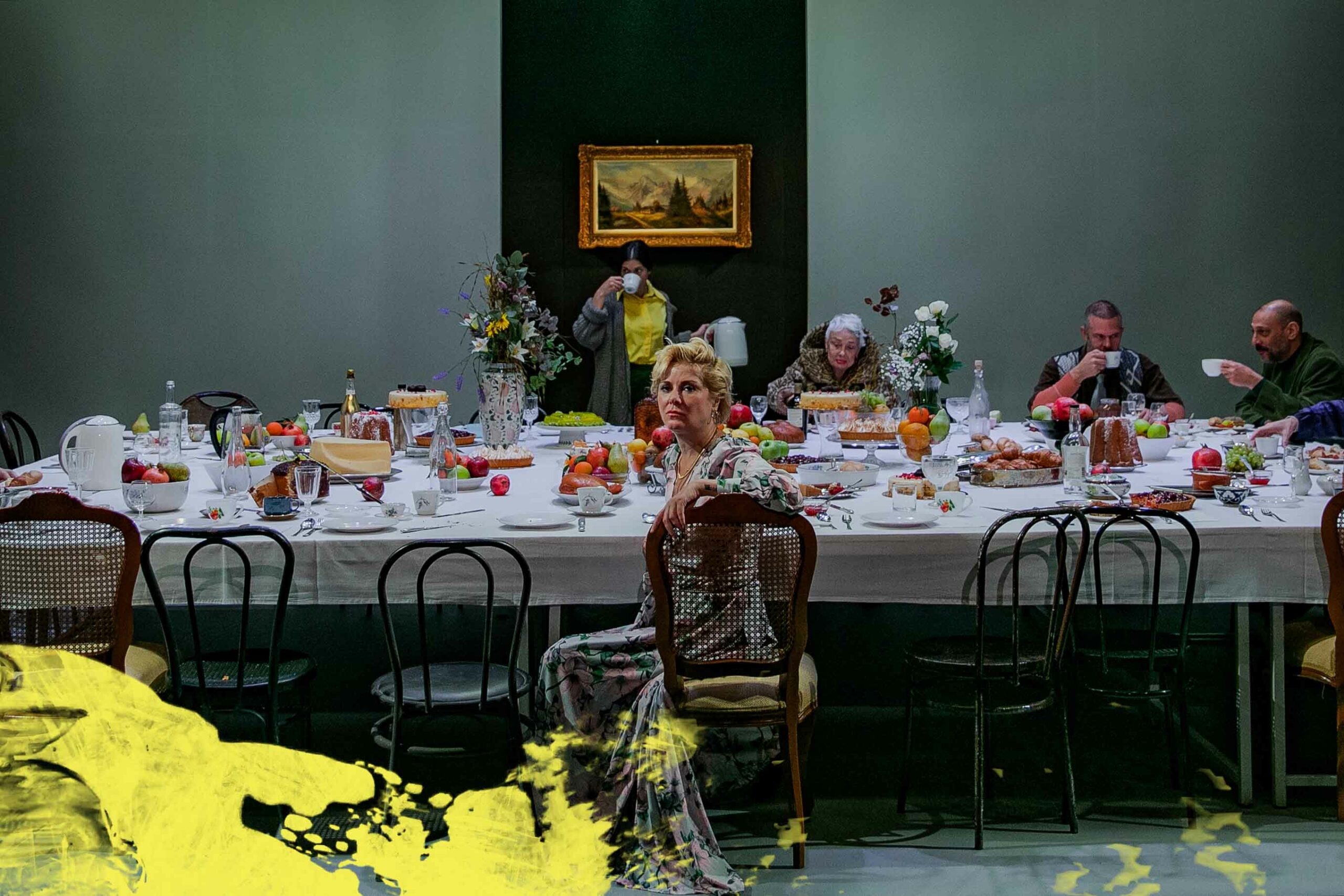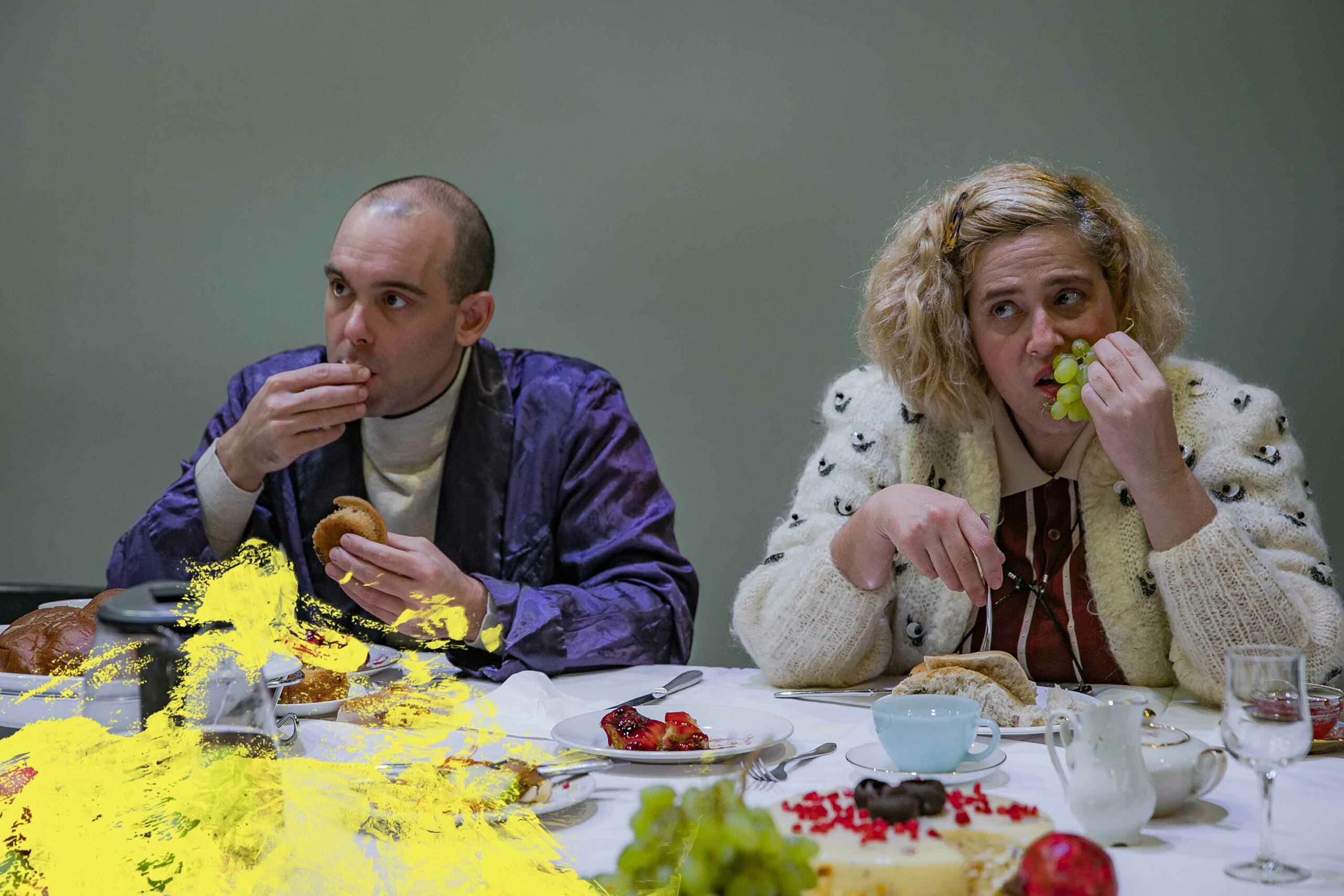 Αφορμή γι’ αυτό το ανέβασμα γίνεται ένα τραπέζι, ένας υπαρξιακός τόπος όπου τα πρόσωπα καταναγκασμένα να συνυπάρχουν ή σα ριγμένα από πάντα εκεί καλούνται να αναμετρηθούν με τη ματαίωση, τις ψευδαισθήσεις και να αποπειραθούν να συμφιλιωθούν με τη ζωή. Το τεράστιο αυτό τραπέζι ως αίθουσα πρωινού ή ως ένα παρατηρητήριο ζωής ή ως ένας τόπος που τα πρόσωπα ανεβαίνουν για να δοκιμάσουν τη διαφυγή τους από την καθημερινότητα ενώπιον των υπολοίπων “καλεσμένων”.